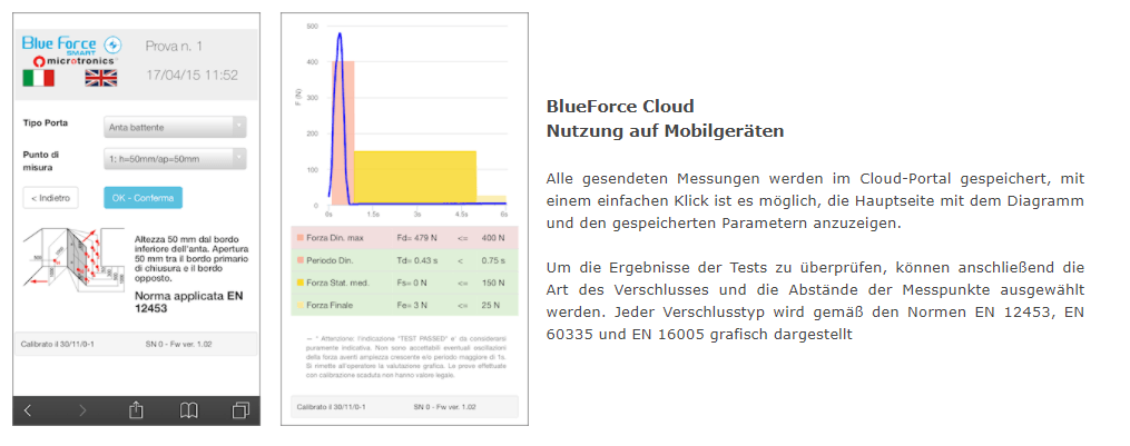 - Im BlueForce Cloud- Bereich ist es möglich, die Kraftmessdaten einzugeben und den zugehörigen Bericht auszudrucken. Für Besitzer des BlueForce Smart Pro Instruments oder für die Upgrade - Versionen werden die Messparameter automatisch an den BlueForce Cloud -Webbereich gesendet.
