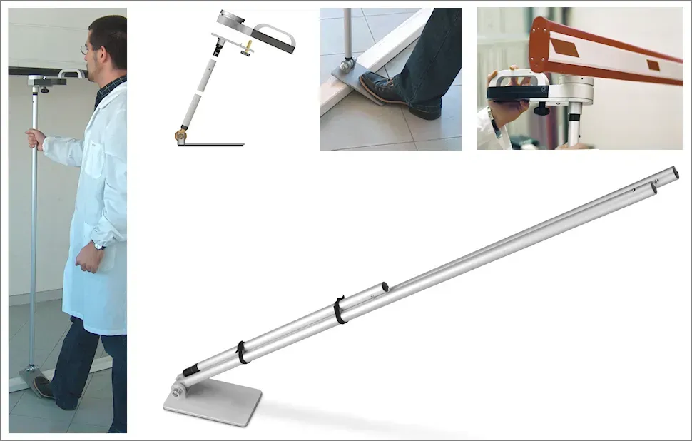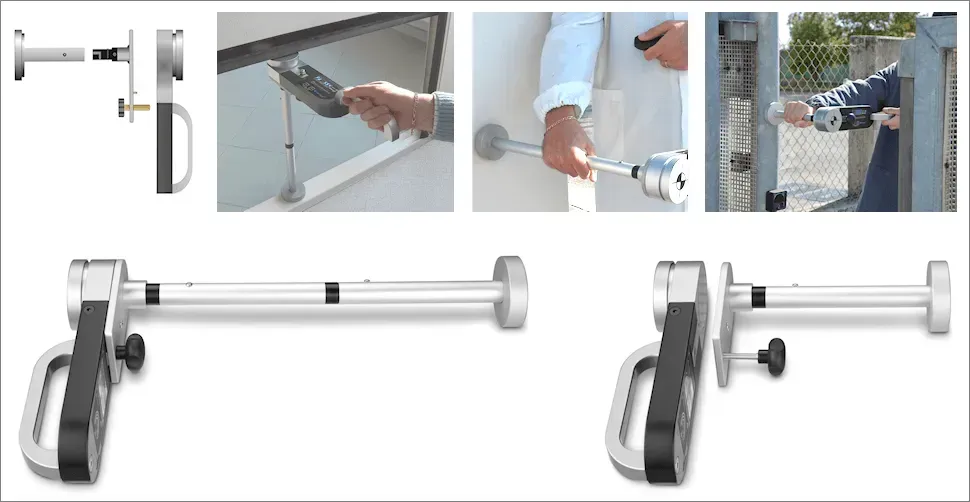 Das Winkelzubehör ist nützlich für Messungen an sektionalen, vertikalen und schwingen Schließvorrichtungen (die normalerweise sehr hoch sind) und auch für Schranken, wo das Gerät schiefe gelegt werden soll.